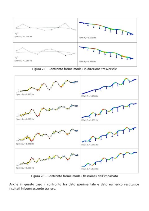 Figura 25 – Confronto forme modali in direzione trasversale Figura 26 – Confronto forme modali flessionali dell’impalcato Anche in questo caso il confronto tra dato sperimentale e dato numerico restituisce risultati in buon accordo tra loro.